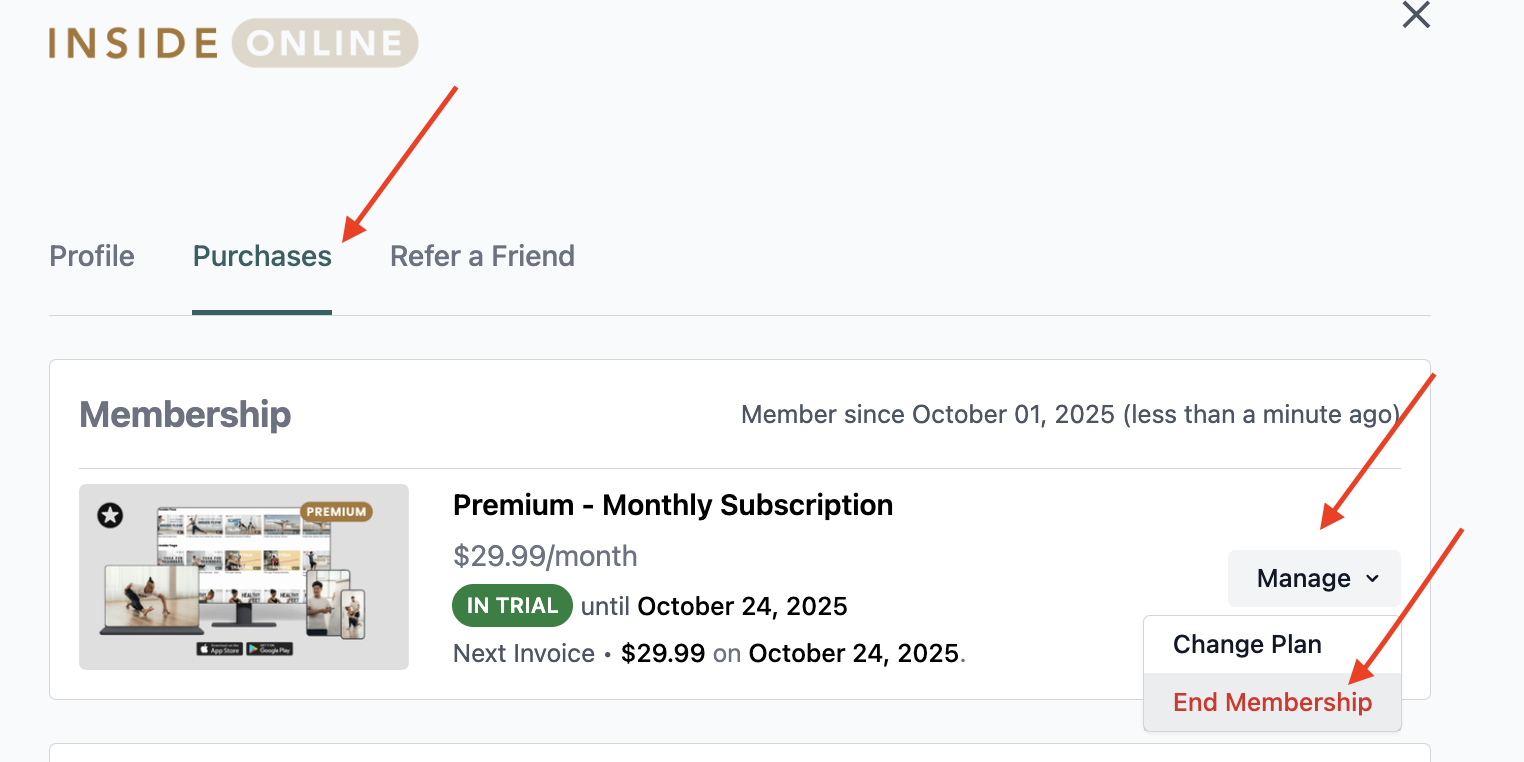 4. Klicke auf die Schaltfläche "Manage und dann auf "Cancel Membership".